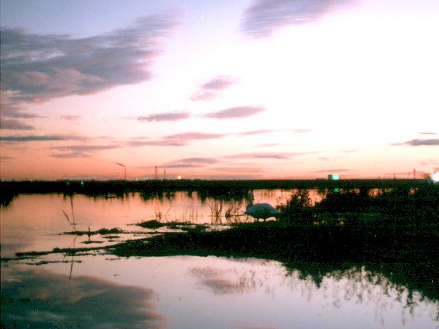 | A swan is standing on the evening shore. | |