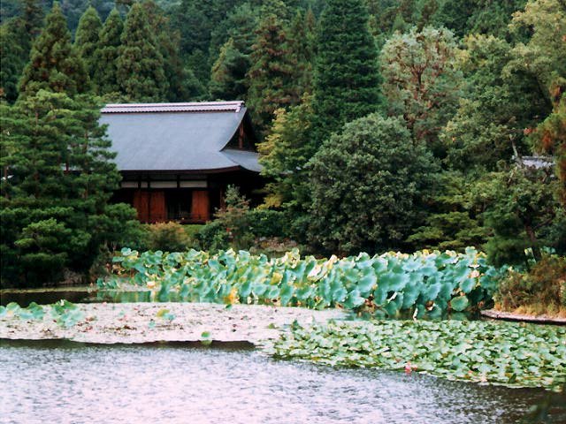 | A Japanese building sits on the edge of a tranquil pond in Kyoto. | |